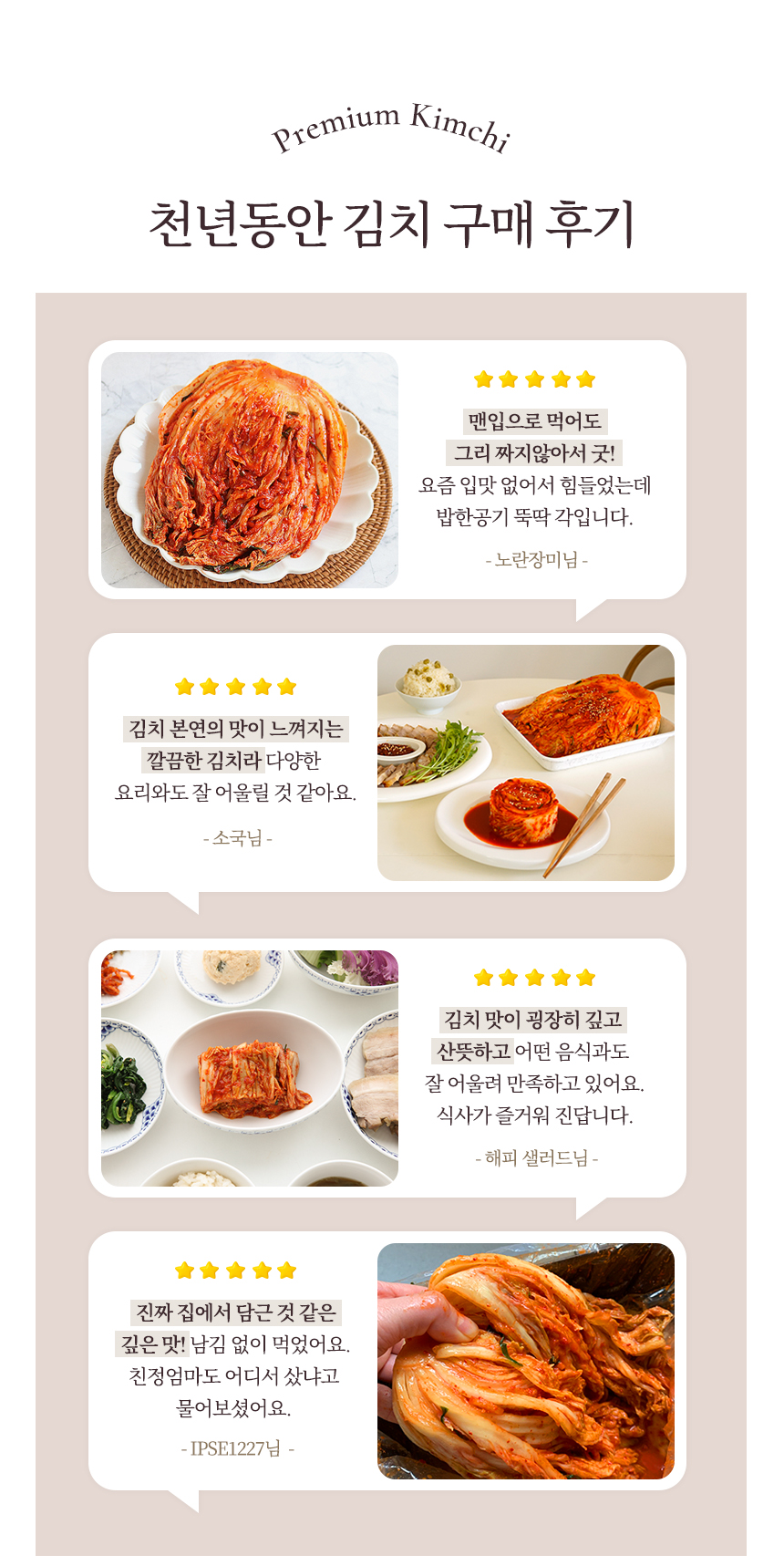 | 배송부터 배추 퀄리티, 맛까지, 뭐 하나 완벽하지 않은게 없네요! 개인적으로 광천 토굴 육젓이 들어가서 그런지 충청도입맛인 저희 가족 입에 완전 찰떡이었어요 :) 넘나 맛있는 것 ㅠㅠ! 주기적으로 사먹어야겠어요! | |||